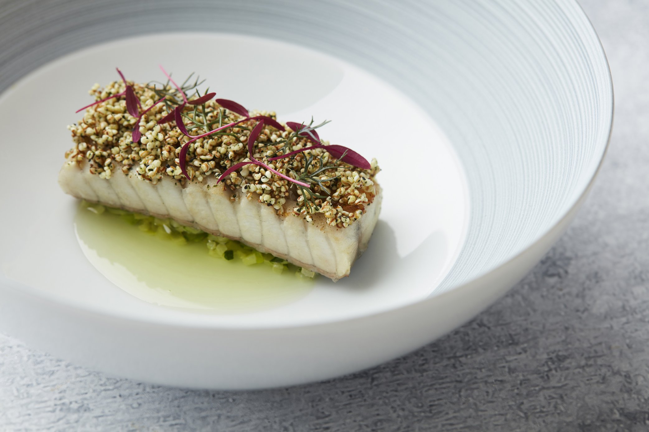Menu maand Tartaar van Sint-Jacobsvruchten wulken bloemkool olie van Franse selder. Frans Belgisch 24 km.